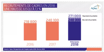 And the outlook is even better for 2018. Companies announce recruitment needs between 248,000 and 271,000 executives, which represents an increase that could reach +13% compared to 2017. The continuation of corporate investments and their needs for supervision and expertise to support the acceleration of digital transformation, energy transition, as well as the evolution of organizations and their management methods, are the main drivers of this dynamic.